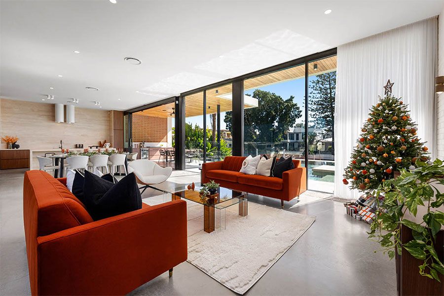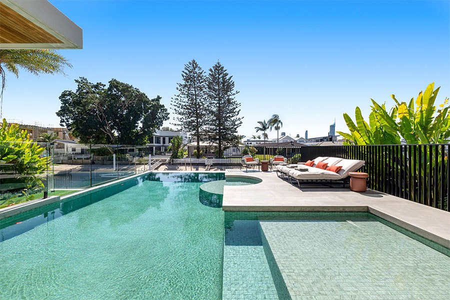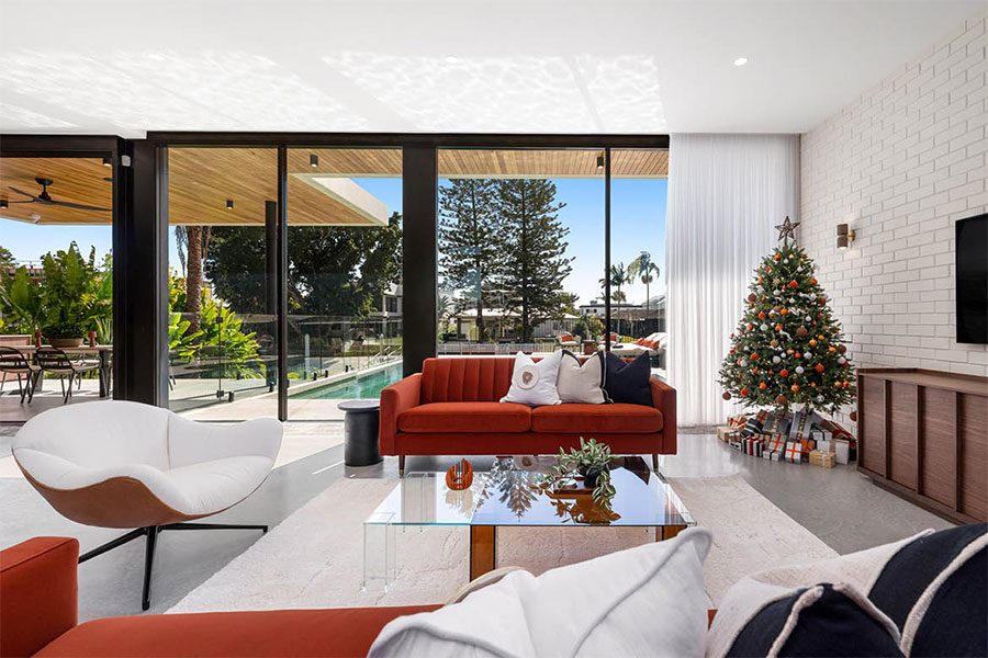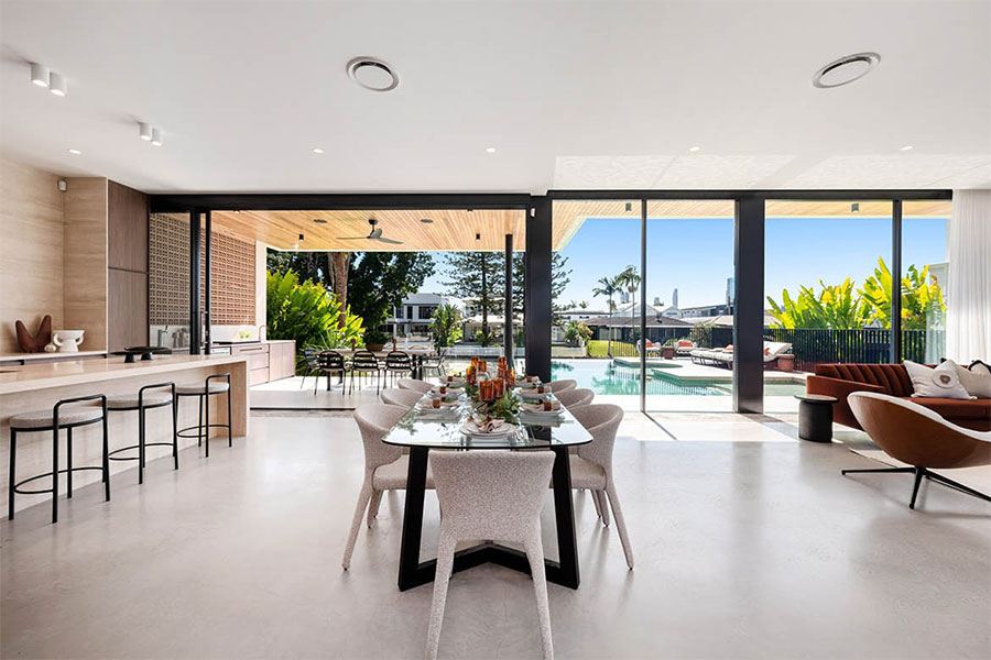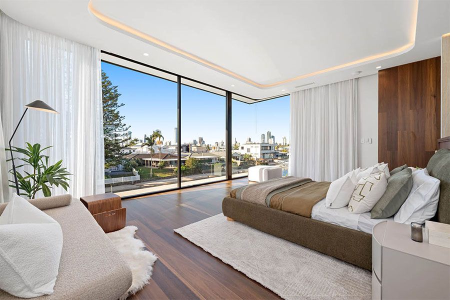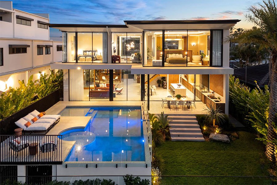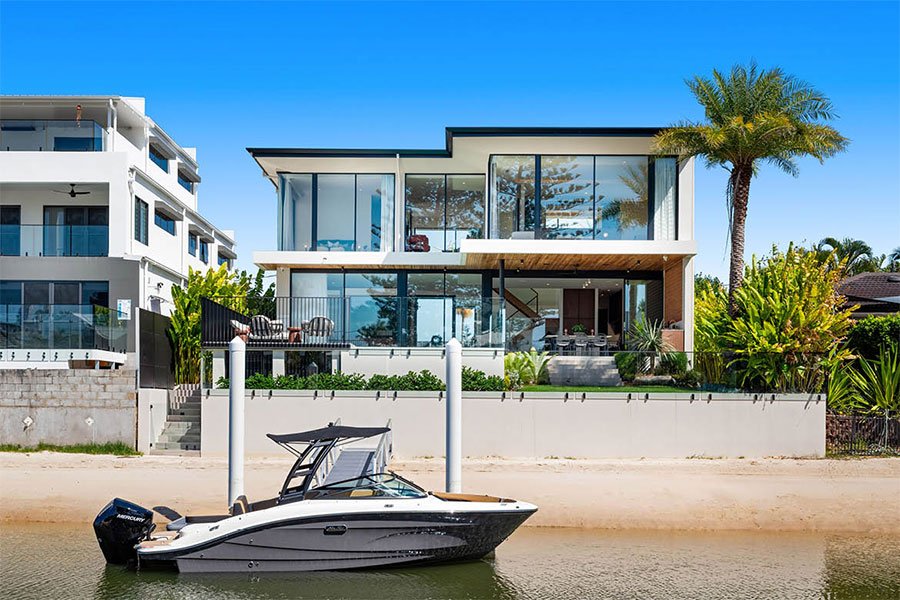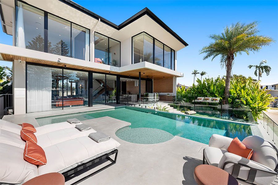 At the heart of it all is a stunning Broadbeach Waters home where modern coastal design meets relaxed luxury. Think sun-filled living spaces with floor-to-ceiling glass, uninterrupted skyline and water views, and a private sandy beach out the back.