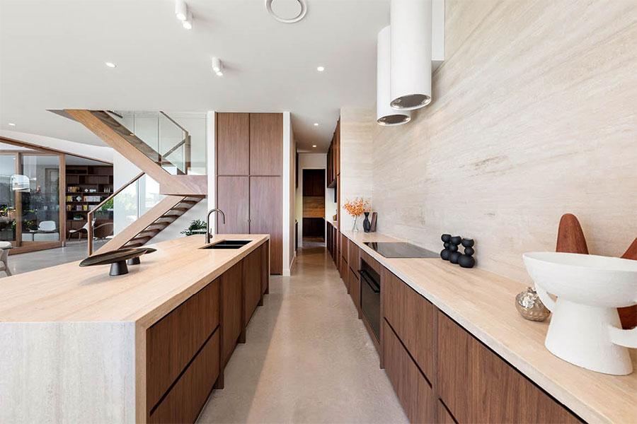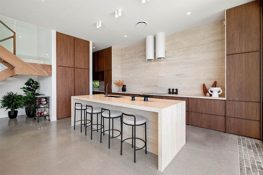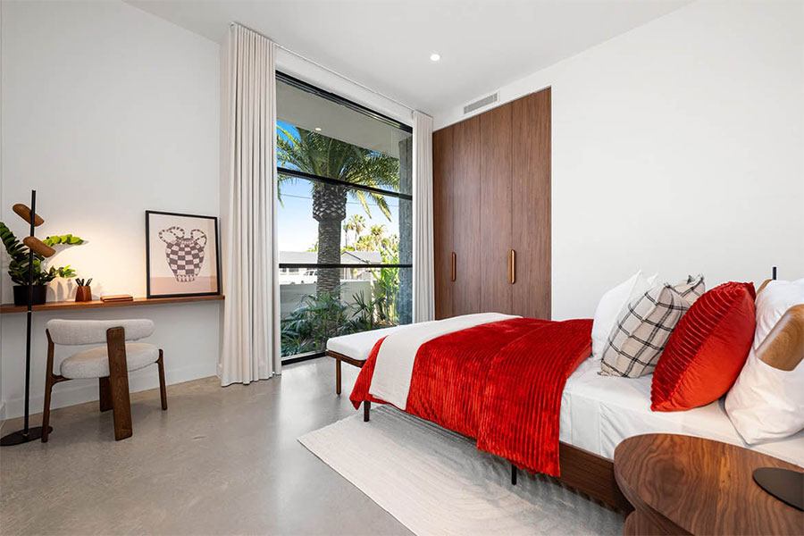 Italian travertine adds elegance throughout, while heated polished concrete floors extend to an entertainer’s terrace featuring an outdoor kitchen and magnesium pool.
