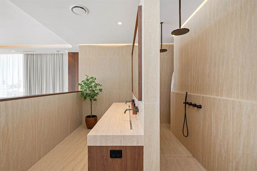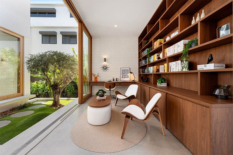 - A private executive office that opens into an atrium garden, centred around a mature olive tree