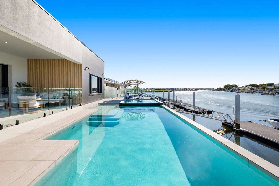 Beyond the pool, the waterfront frontage and private pontoon introduce a level of usability that goes well beyond scenic value. Water access becomes practical rather than ornamental, supporting activities that range from casual kayaking to boating.