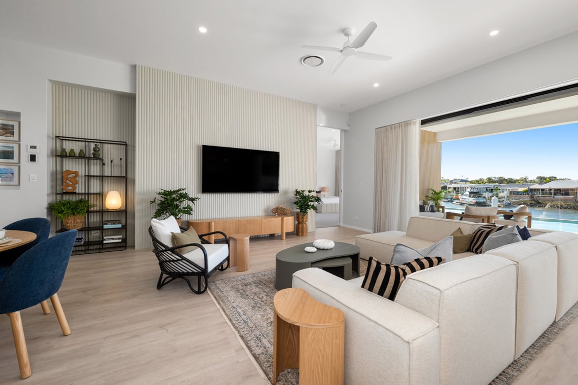 Large openings face the water, drawing light across the interior and extending views deep into the home. These sightlines are not incidental. They guide how the space is used throughout the day, whether that’s quiet mornings overlooking the channel or evenings spent entertaining with the doors open.