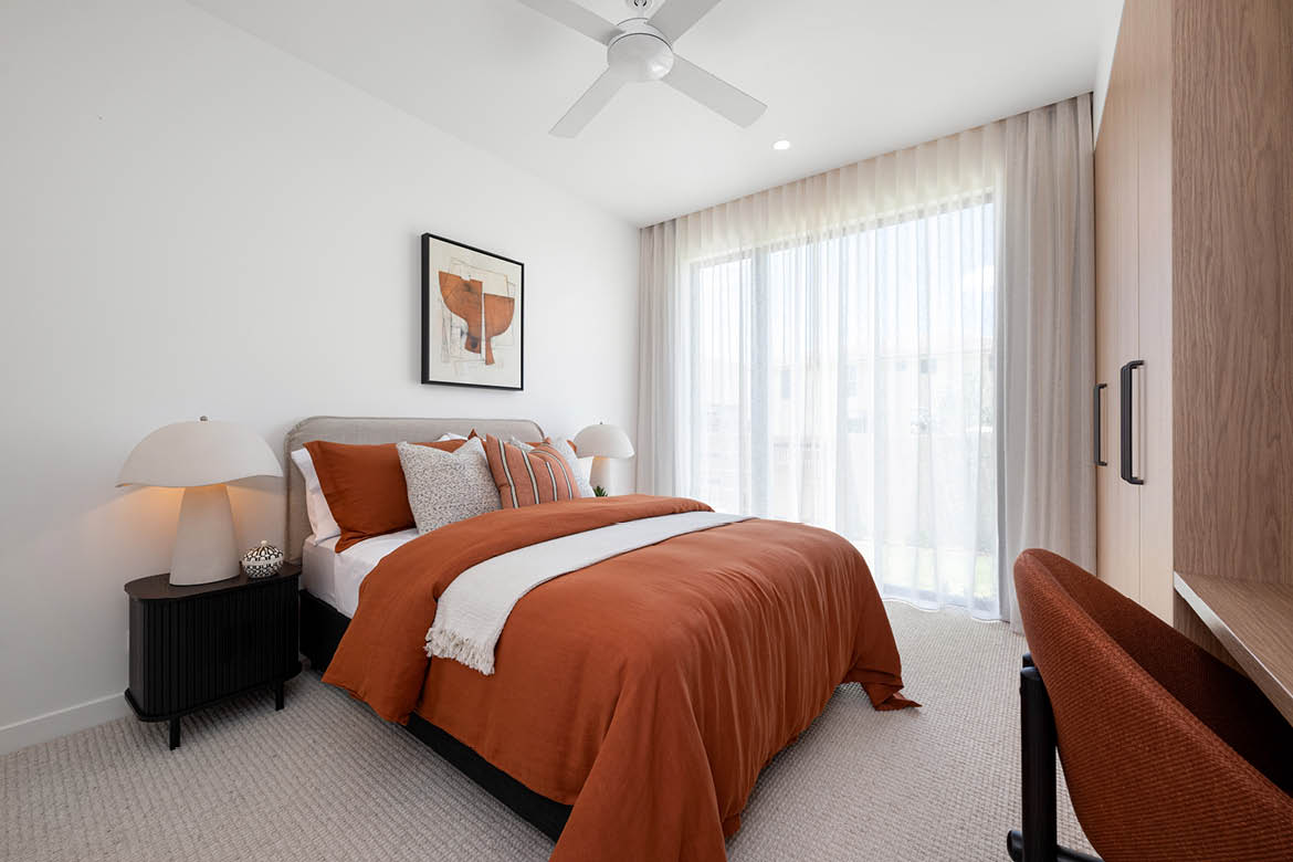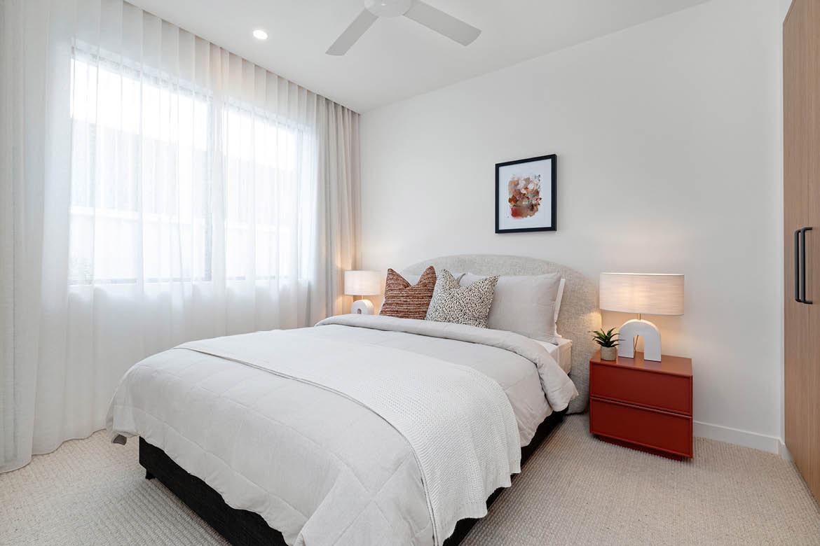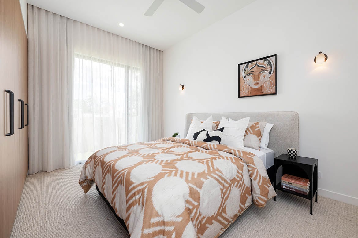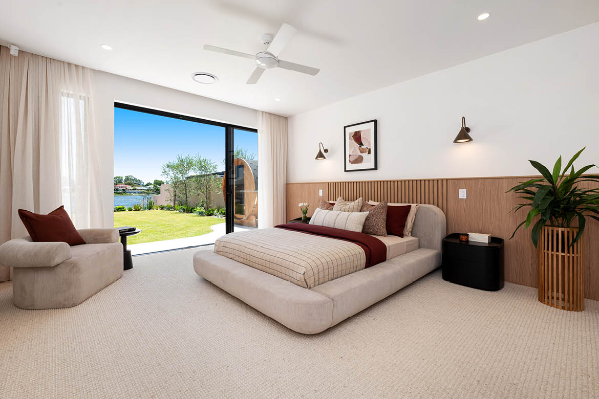 The main suite provides a more secluded area within the home, positioned to feel distinct from the central living zone. This separation allows it to operate as a private retreat while still remaining easily connected to the rest of the house.