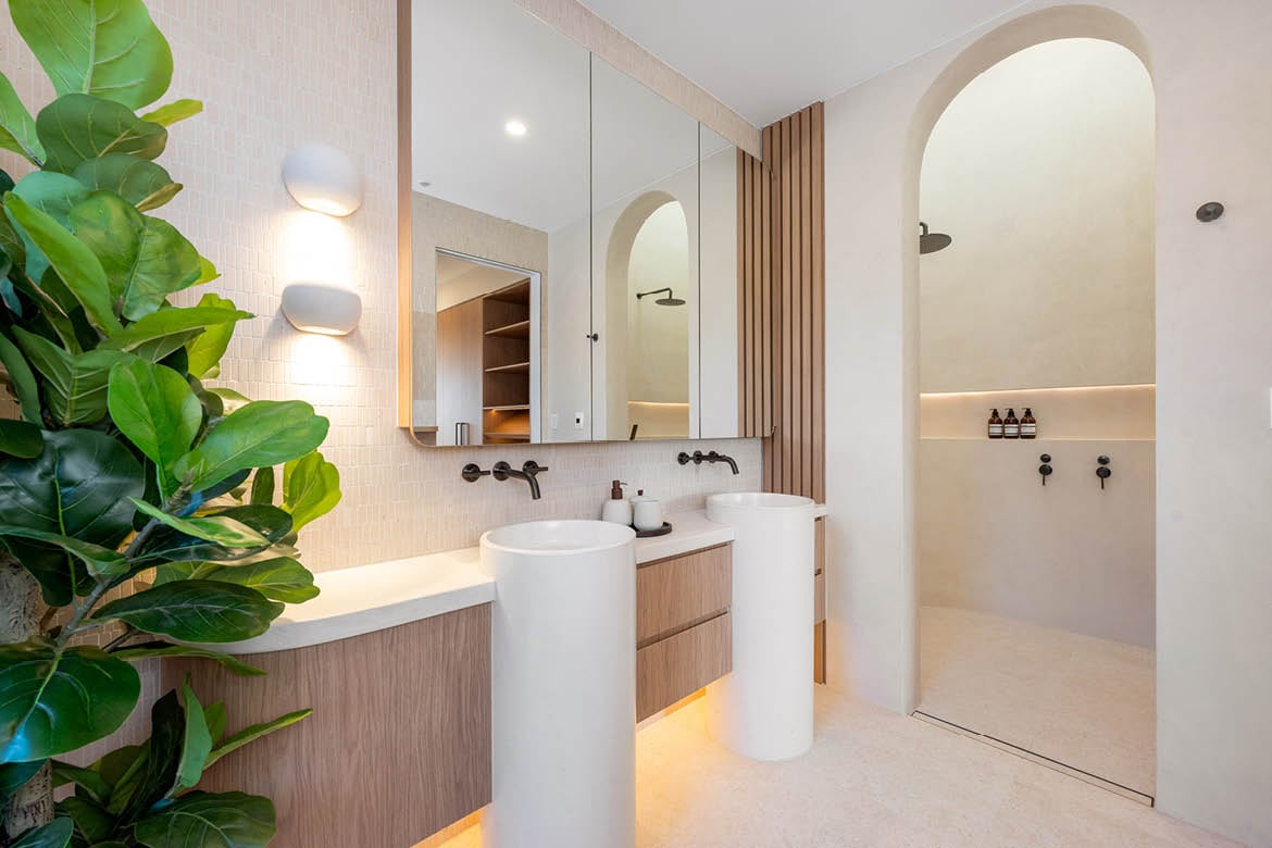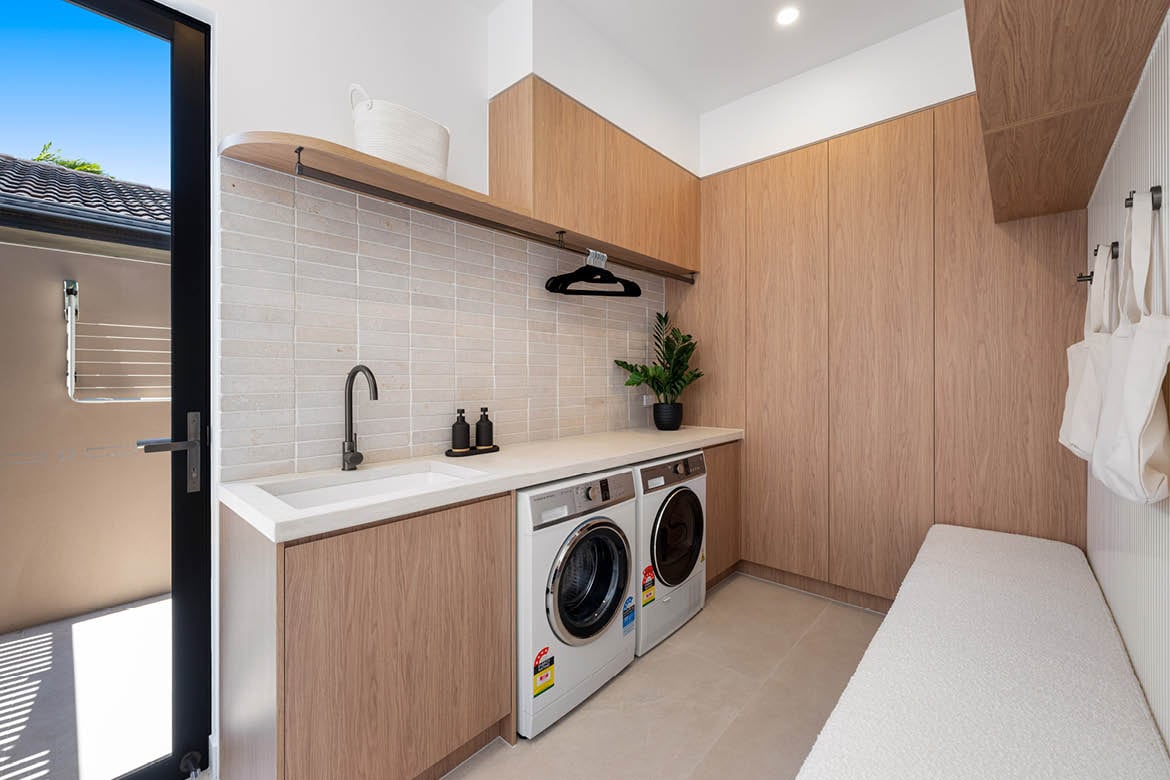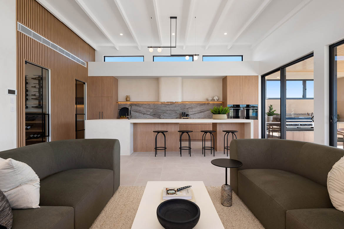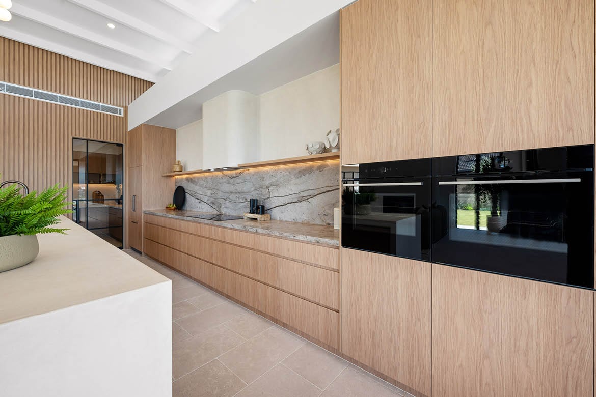 The kitchen’s direct connection to outdoor entertaining areas ensures the home functions equally well for indoor dining and alfresco gatherings.