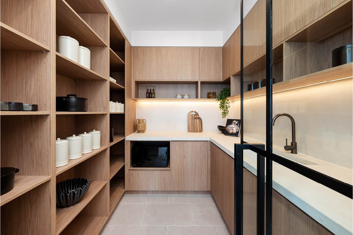 Bench surfaces offer ample working space and cabinetry has been designed to provide practical storage without interrupting the visual flow of the room.