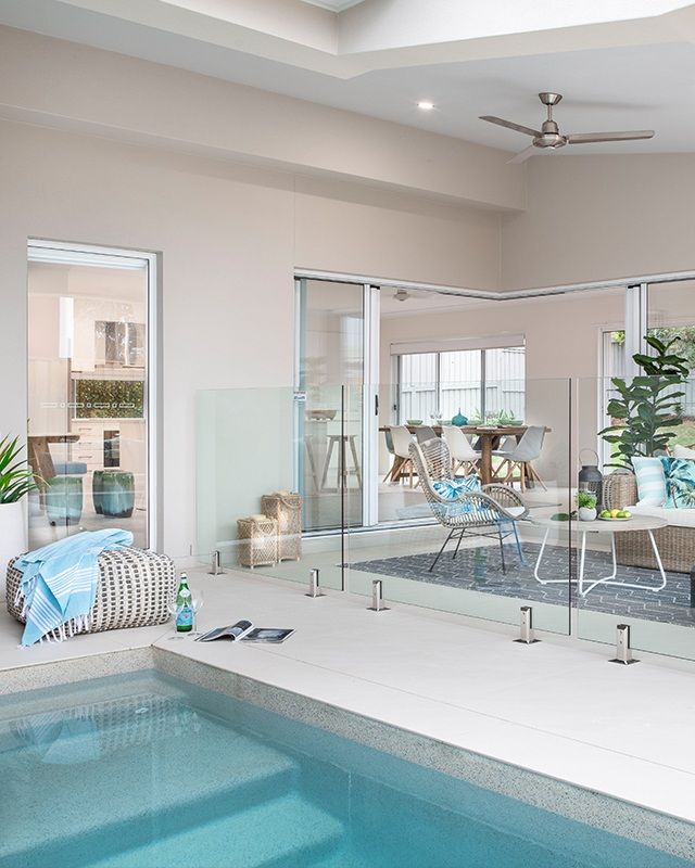 The open plan living area has a comfy lounge, a dining table that easily seats eight and a gleaming white kitchen with a double-wide island. There’s even a casual nook with benches and throw cushions where you can work on a hobby or enjoy a game of cards. Between the dining and living areas, wide doors open onto a side patio with a fire pit in the spacious fenced yard. Across from the kitchen, two sets of right-angled doors open fully to integrate the alfresco and outdoor lounge with the main living area. Deep couches look onto the T-shaped swimming pool that gives you a lovely place to cool off on a hot day.